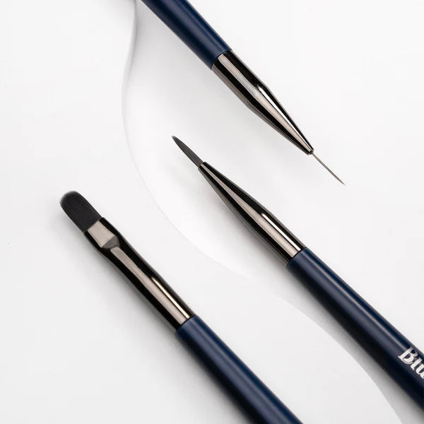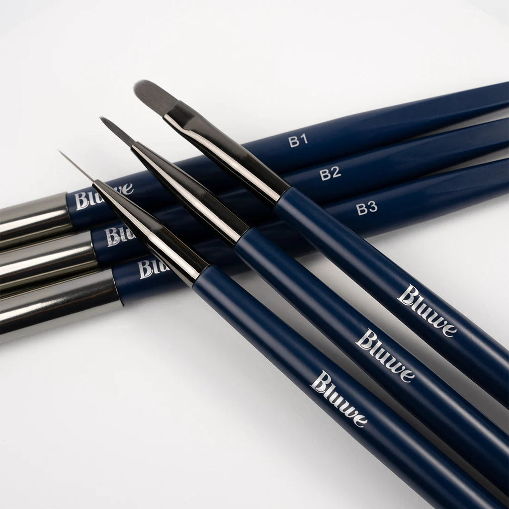 O Kit de Pincéis da Bluwe contém 3 pincéis, o B1, B2 e B3. Cada um deles cumpre um papel no procedimento, desde a aplicação do Gel Capa Base até o acabamento.