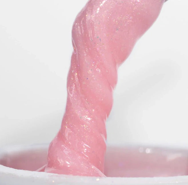 COR: Quartzo rosa - Gel leitoso com fundo rosado e brilhos multicoloridos.